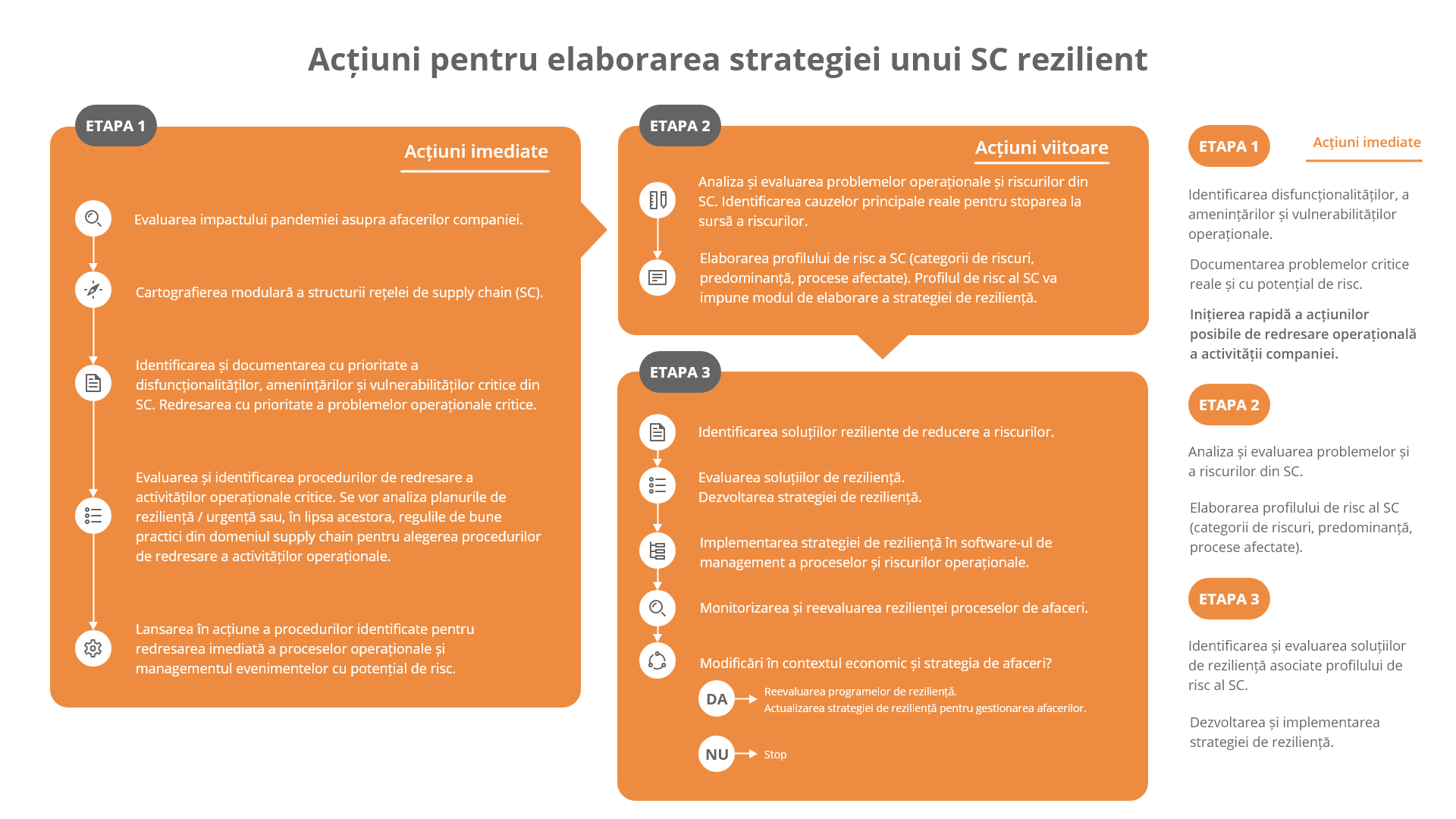Schema de mai jos prezinta metodologia propusa de construire a strategiei unui SC rezilient, pornind de la actiunile imediate si continuand cu actiunile viitoare, de perspectiva.