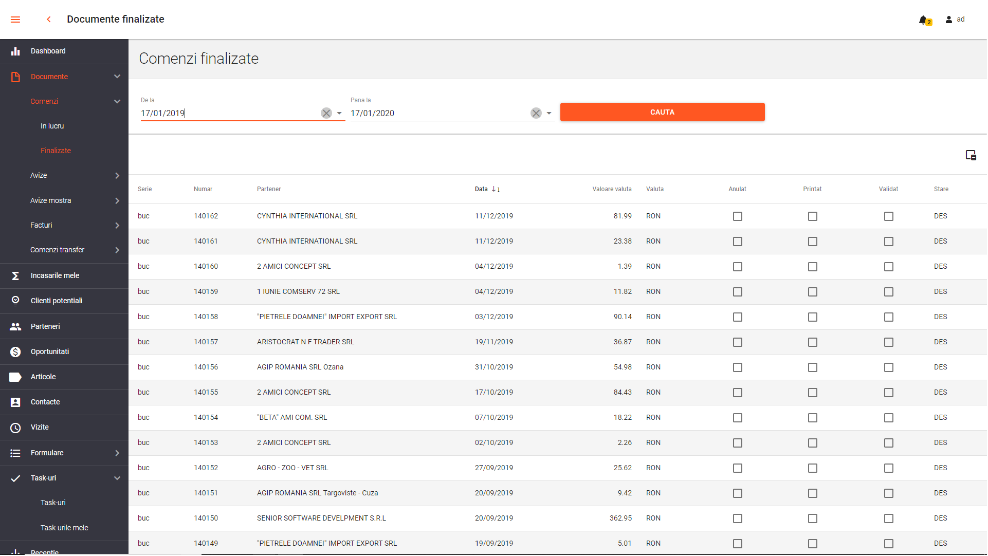 Cu SeniorERP Mobile gestionezi intregul proces de vanzare, de la preluarea comenzilor de la clienti, pana la incasarea creantelor. Aplicatia ofera functionalitati complete: