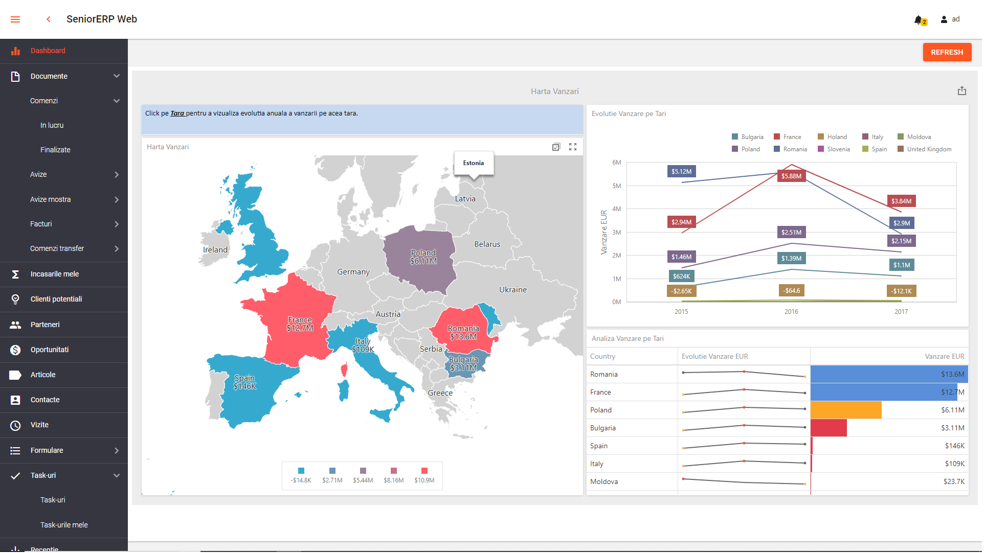 Angajatul de pe teren poata sa vada imediat cum a performat intr-un anumit interval de timp, analiza activitatii fiind realizata instant prin intermediul dashboardurilor disponibile in SeniorERP Mobile. Aceste dashboarduri pot fi personalizate cu usurinta pentru a servi scopului urmarit de fiecare utilizator in parte. Astfel, pot fi analizate cu usurinta, prin intermediul unor grafice intuitive, vanzarile la nivel de agent, zona, produs, client si nu numai, taskurile realizate de fiecare agent in parte, situatia soldurilor clientilor si multe altele.