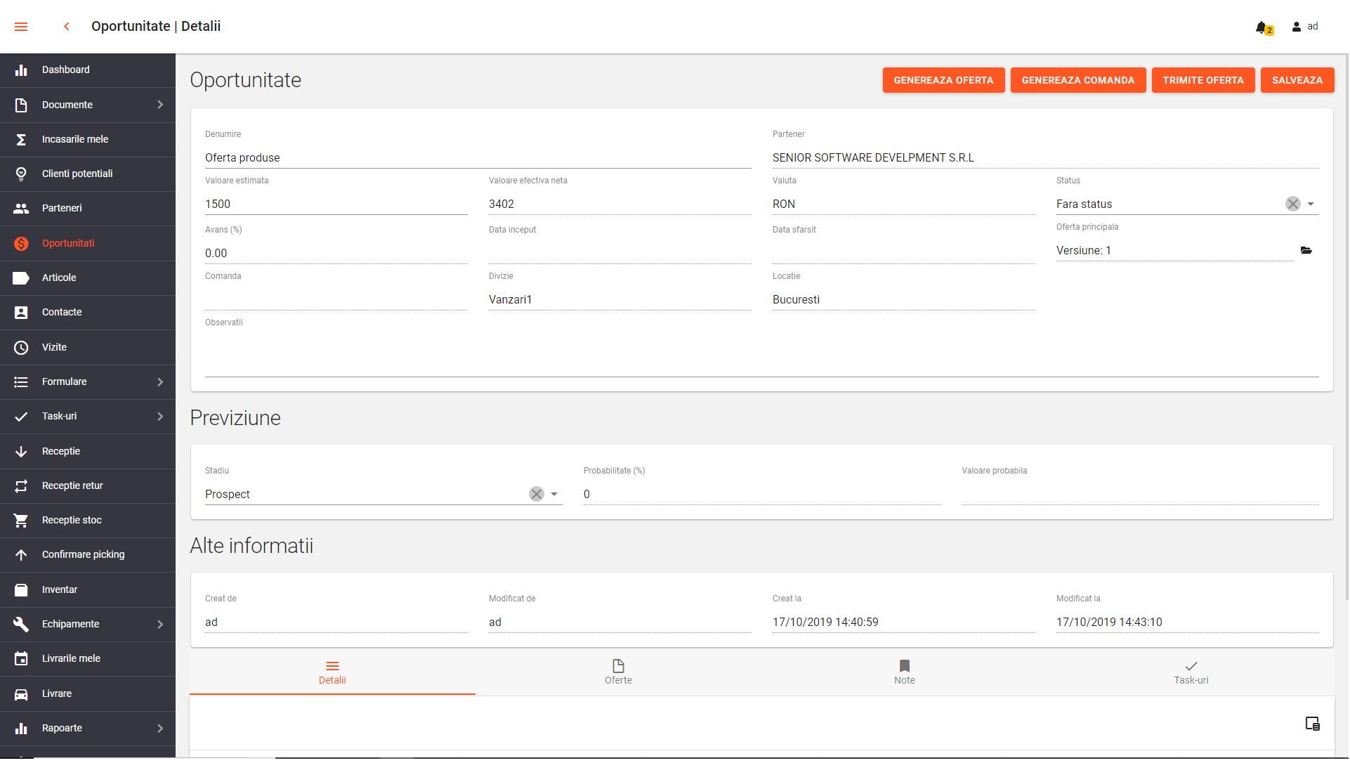 Adauga cu usurinta clienti potentiali, creeaza oportunitati si transforma-le apoi in comenzi de vanzare.