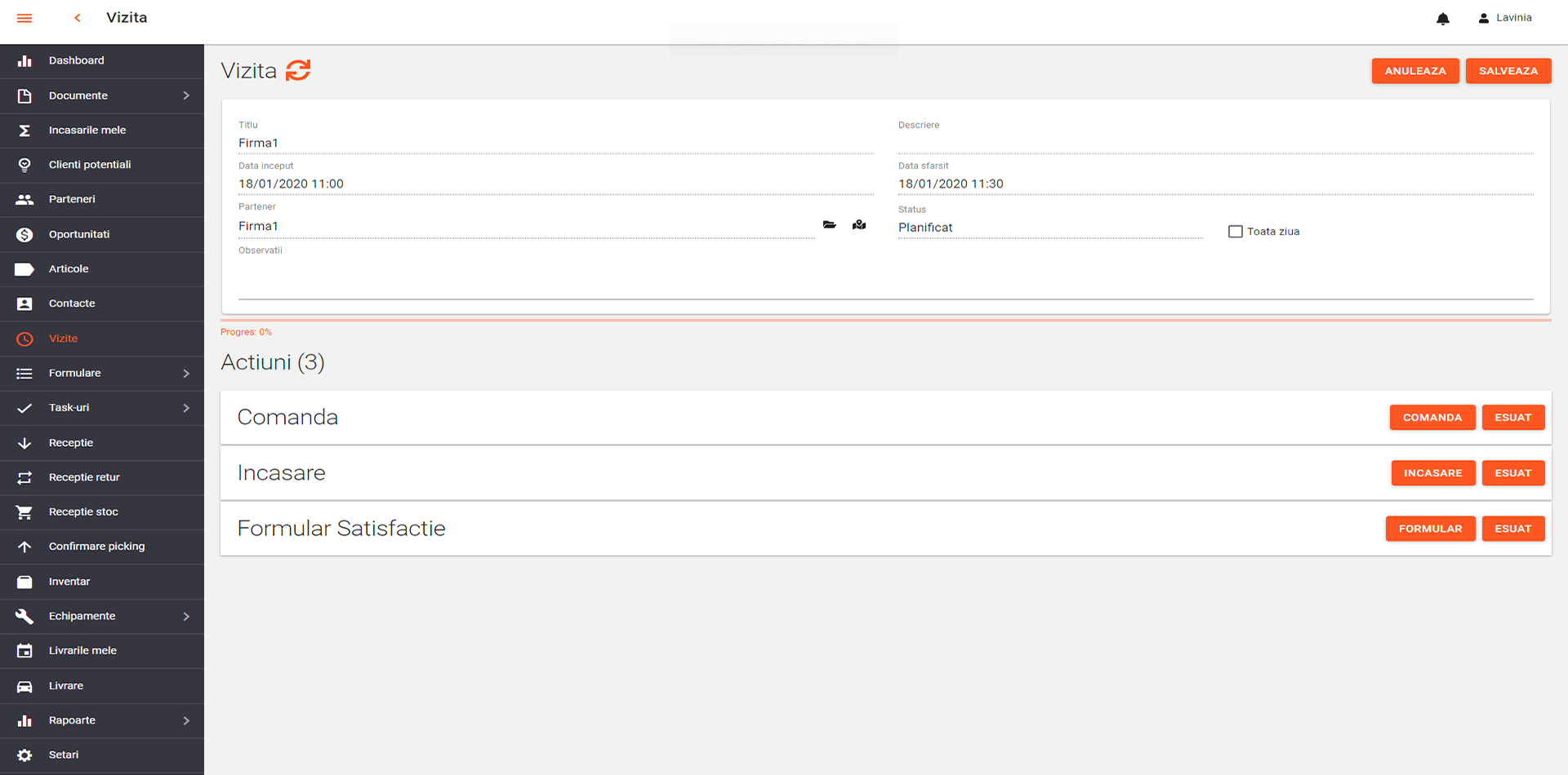 Organizeaza eficient activitatea din fiecare zi, adaugand in calendar vizitele la clienti. Acestea pot avea ca scop preluarea unei comenzi, incasarea unei facturi sau completarea unui formular. Toate vizitele se planifica exclusiv din SeniorERP si sunt vizibile instant in aplicatia mobila.