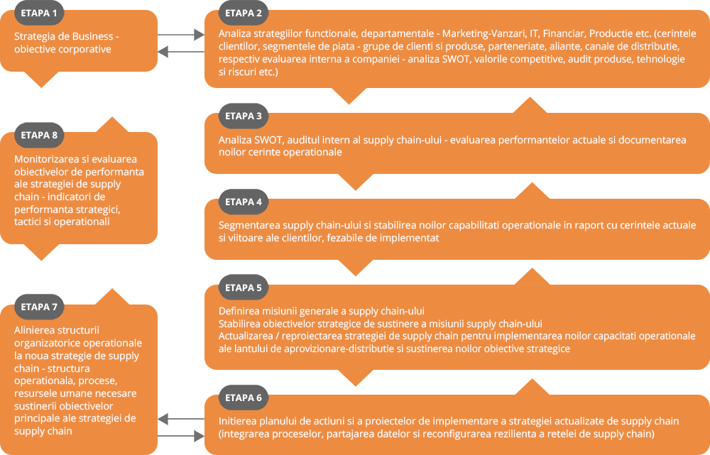 Indiferent de schimbarile produse in obiectivele de afaceri, respectiv reducerea costurilor, extinderea gamei de produse, rationalizarea activelor, cresterea nivelului de servire a clientilor, extinderea cotei de piata, este important ca modificarile aduse in supply chain sa sustina atingerea noilor obiective din strategia de afaceri. Fara strategie nu poti fi anticipativ. Uneori, strategia de afaceri si cea de supply chain sunt putin defazate si trebuie aliniate pentru a va concentra pe ceea ce doriti sa obtineti in perioada urmatoare.