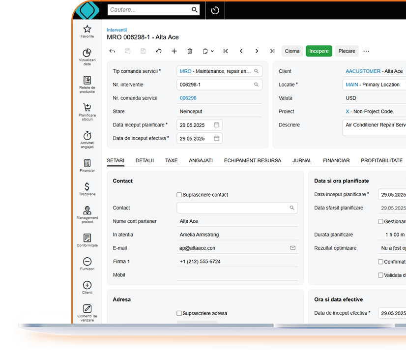 Planificarea si alocarea resurselor, monitorizarea si optimizarea timpului si costurilor, precum si gestionarea echipamentelor si stocurilor necesare pentru prestarea serviciilor pot fi administrate eficient printr-un sistem complet dedicat activitatilor de service. Solutia este capabila sa acopere cu succes atat activitatile de instalare, cat si tipuri de mentenanta, realizand managementul optim al fiecarei etape de lucru: